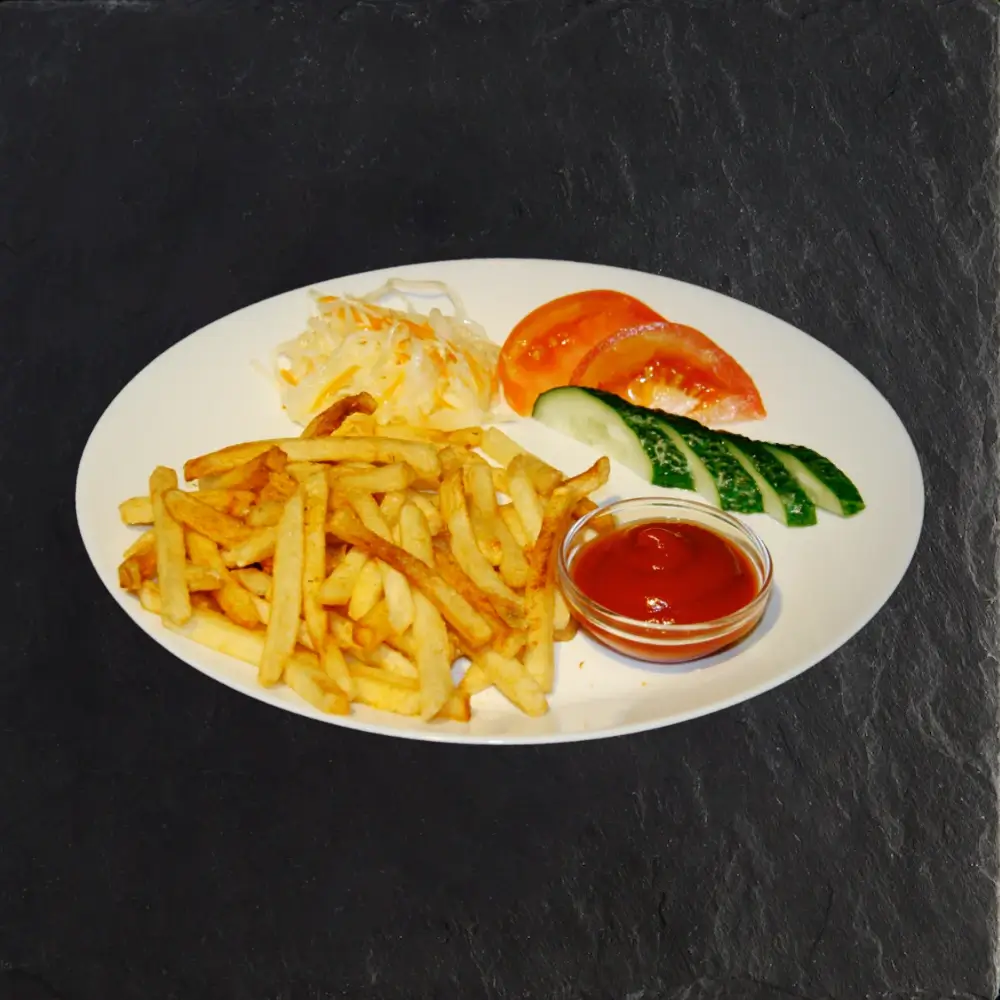 Картофель фри, обжаренный до золотистой корочки. Подаётся с кетчупом, свежими томатами, огурцом и салатом из свежей капусты.
