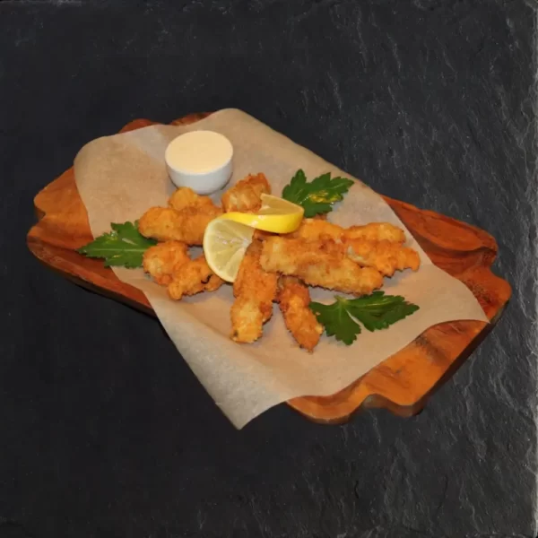 Сочные полоски филе минтая в панировке, обжаренные до хрустящей корочки. Подаются с майонезно-чесночным соусом.