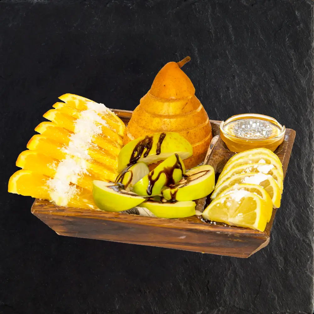 Фруктовое ассорти из яблока, груши, апельсина  и лимона. Подаётся с мёдом.