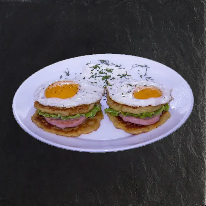 Картофельные драники, обжаренные до золотистой корочки. Подаются с яичницей-глазуньей и нежной ветчиной.