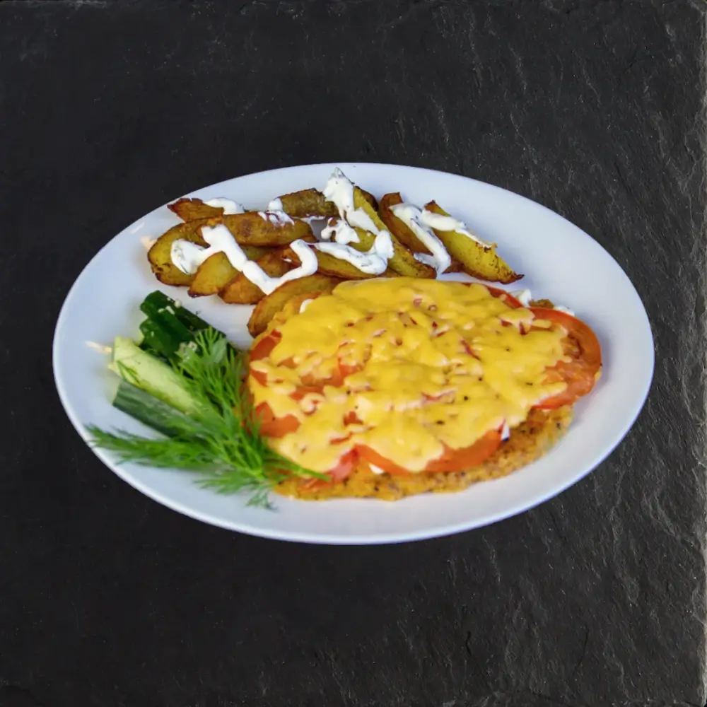 Филе птицы под сырно-майонезной шапкой с добавлением томатов. Подаётся с хрустящим картофелем айдахо и битыми чесночными огурчиками.