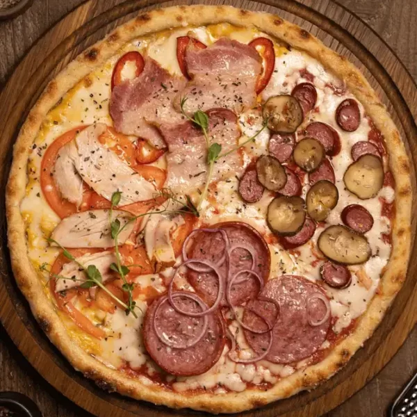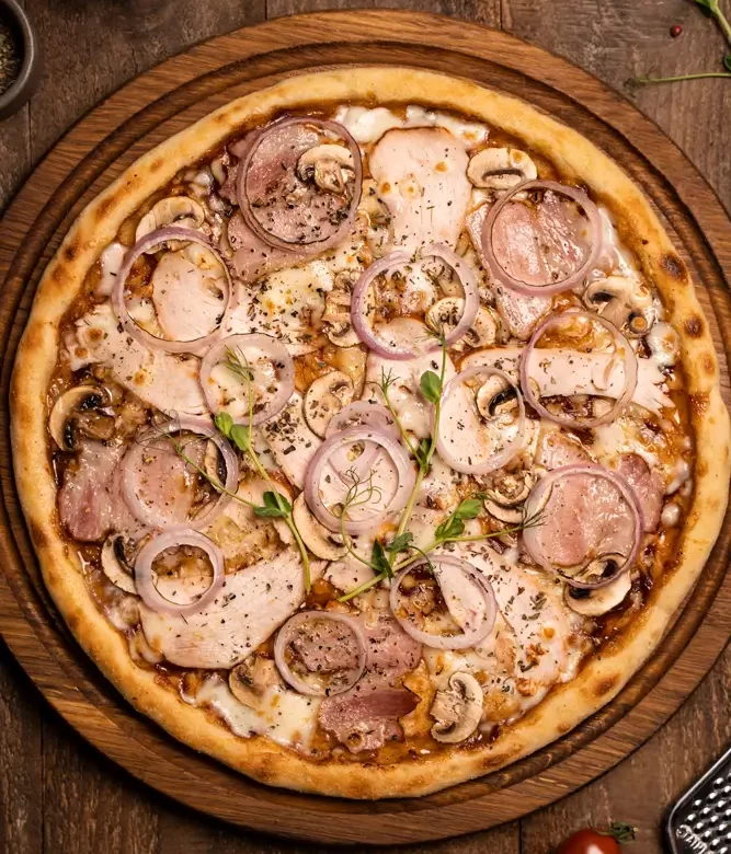 Соус барбекю, филе птицы, бекон, грибы шампиньоны, лук репчатый, сыр моцарелла, соус чесночный.