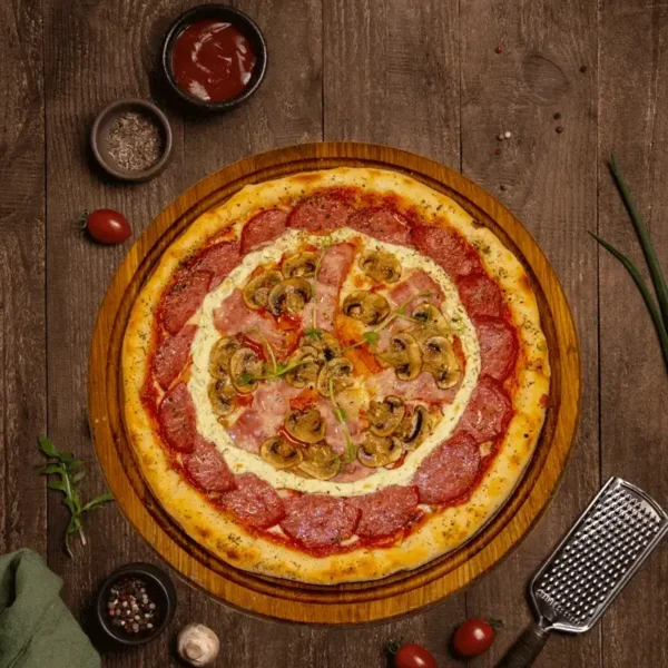 Томатный соус для пиццы, колбаса салями, сыр Моцарелла, соус чесночный.