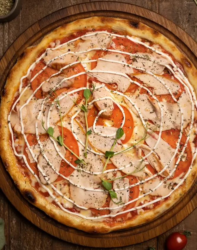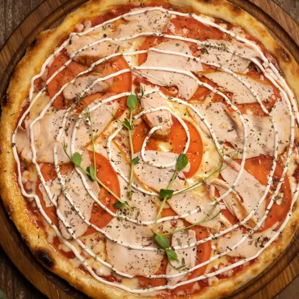 Соус томатный для пиццы, филе птицы, томаты свежие, сыр Моцарелла, майонез, соус чесночный.