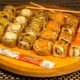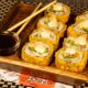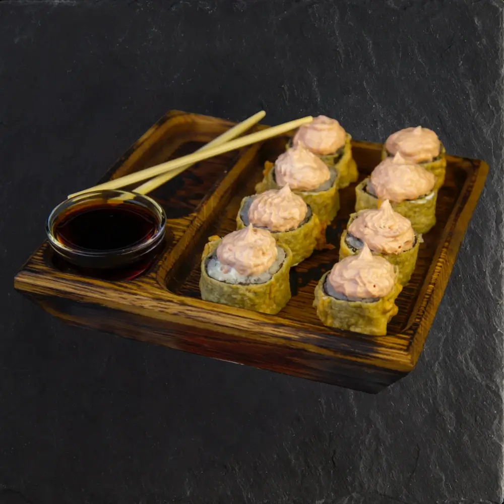 Нори, рис, креветки, крем-паста лососевая, кляр яичный, соевый соус.