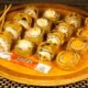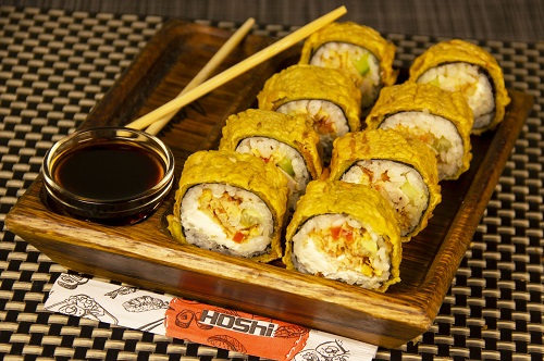 Нори, рис, креветки, майонез, крем-паста лососевая, сухари панировочные,  кляр яичный, соевый соус.