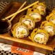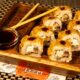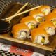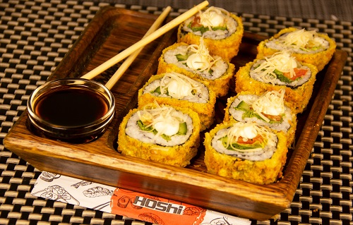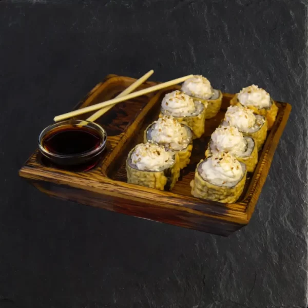 Нори, рис, филе птицы, салат Айсберг, томаты свежие, огурец свежий, соус «Цезарь», сыр Джугас, яичный кляр, сухари панировочные, соевый соус.