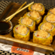 Сыр Филадельфия, нори, томаты свежие, филе птицы, кунжут, рис, сливочно-чесночная крем-паста, яичный кляр, соевый соус.