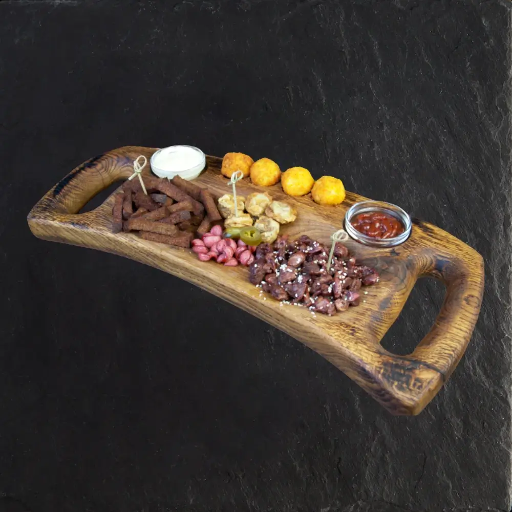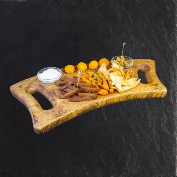 Блюдо из ароматных чесночных гренок, пряных охотничьих колбасок, обжаренных куриных желудочков, нежных картофельных шариков в хрустящей панировке и сочных шампиньонов в кляре. Подаётся с двумя видами соуса.