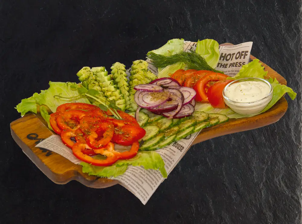 Свежие томаты, огурцы, перец, лук красный маринованный. Подаётся с соусом Ранч.