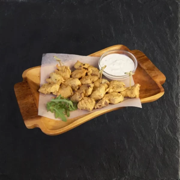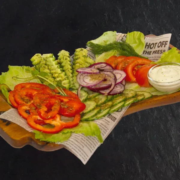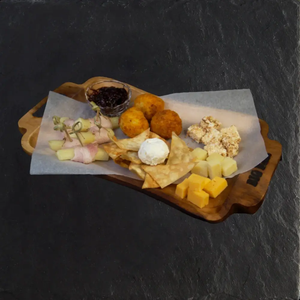 Хрустящие сырные шарики, сыр Фетта в кунжутной панировке, сыр Филадельфия с хрустящим лавашом и тянущийся сыр Сулугуни в беконе. Подаётся с луковым мармеладом.